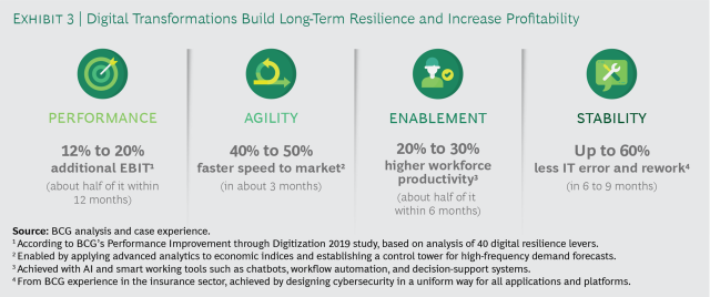 The COVID-19 crisis has turned the spotlight on the urgent need for companies to become resilient, and the importance of digital technologies in making this transformation. As markets and economies are likely to continue to change rapidly, uncertainty will persist. Only a small group of resilient companies will be able to capitalize on the opportunity to grow stronger in the face of uncertainty. Investing in digital resilience will help companies both accelerate out of crises quickly and create sustainable competitive advantage in the new reality.